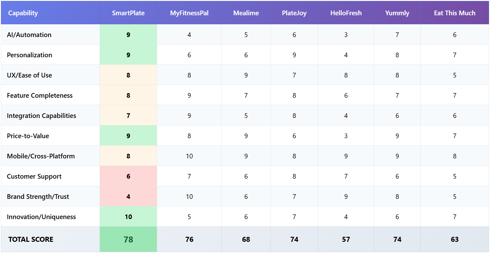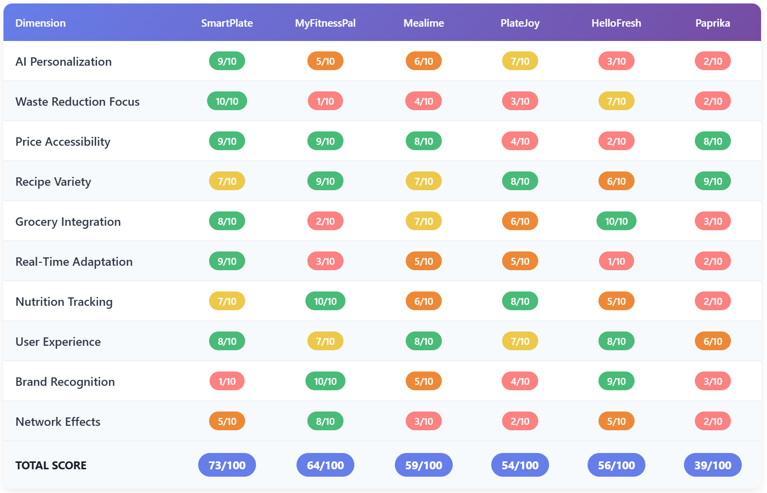 The tool doesn't just list competitors—it researches them, analyzes their positioning, and scores them against your proposed solution across dimensions like: